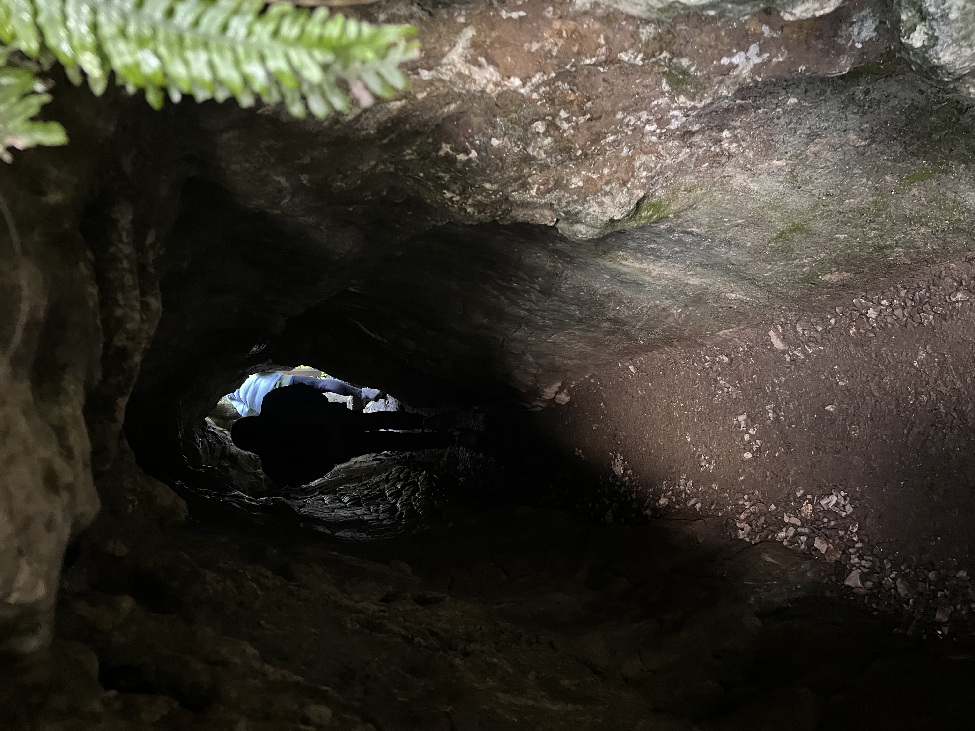Caves such as this are formed like other limestone caves. The limestone here, as elsewhere, is the compacted remains of a reef system which once lay in shallow warm waters. Subsequent tectonic uplift has resurfaced the rock, which is mainly composed of calcareous matter, derived from the shellfish, fish and coral organisms. Limestone is susceptible to dissolving once water passing through it has an acid makeup, usually derived from absorption of carbon dioxide in the atmosphere. This percolating groundwater decomposes the limestone, creating fissures and cracks streams can later exploit to form cave systems.