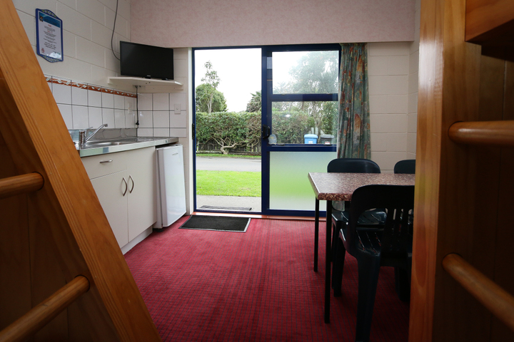 Deluxe Cabins are studio-style units with beds at the back and table & chairs at the front with kitchenette. Double bunk with single on top, there is a single bed or single bunk beside it with a set of drawers.