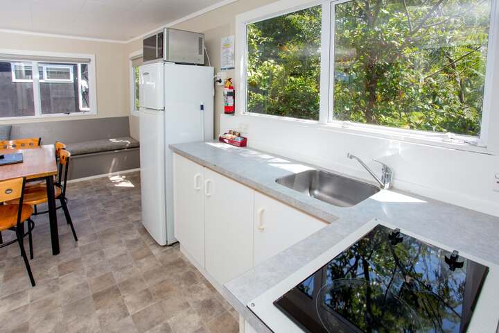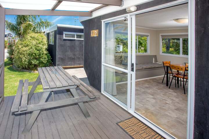 These older style lodges are setup with a Queensize bed (bedding and towels provided), a further bunk room with two sets of bunks, a small kitchette with a microwave, hot plate, fridge/freezer, cooking utensils and TV. Shower and toilet is in the room. There is indoor-outdoor seating with a small deck on the front of the unit.