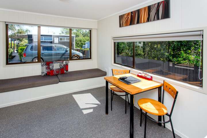 This older style lodge is setup with a Queensize bed (bedding and towels provided), a small kitchette with a microwave, hot plate, fridge/freezer, cooking utensils and TV. Shower and toilet is in the room.