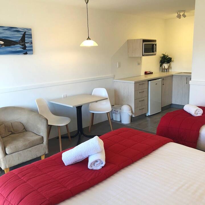 Queen bed units - sleep 2 to 3 in living area, Sky TV, DVD, hairdryer, iron, cook top, microwave & fridge, dining table, bathroom.