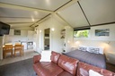 Sleep up to 5 with double bed, plus a set of bunk beds. TV, jug and fridge. Bottom sheet, blanket and 2 towels provided. Supply own cooking and eating utensils. Adjacent to the campground kitchen and ablution block. Close to BBQ and adventure playground.