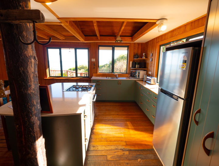 A fully equipped kitchen and open plan style living room opens out onto a large deck putting you amongst the surrounding native virgin forest and offers spectacular views of the Tasman Sea, which is a stones throw away. A perfect spot to watch the local Hector dolphins which are often seen playing in the waves.
