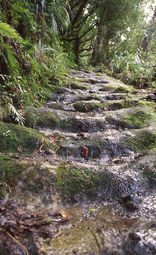 The Billygoat Basin is perched high in the ranges to the east of the main Kauaeranga River. When the kauri loggers attempted to transport the timber to the valley floor, logs falling over the 180-metre high Billygoat Falls shattered. Logs taken from a holding dam above the falls via a wooden tramline and log chute were smashed on reaching the valley floor.