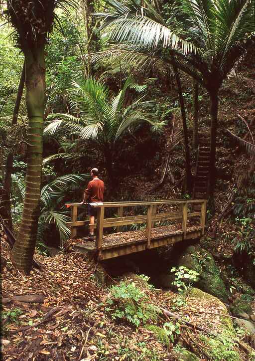 After approximately 1 hour the main spring becomes evident by a faint sulphurous whiff and a red leachate that tarnishes the clear water. A small pipe, which feeds the pools below, appears and the track surface improves as you descend to the Nikau Plunge Pools.