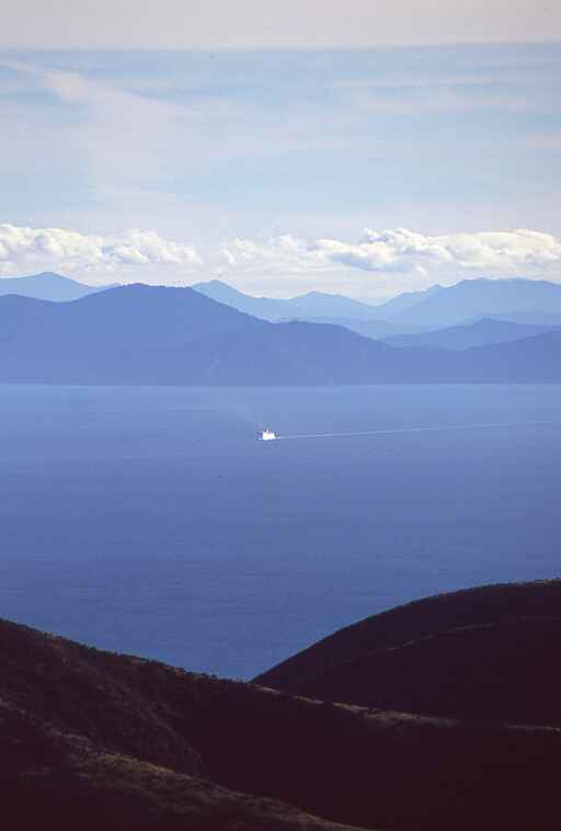 The snow-capped peaks of Manakau and Tapuae-O-Uenuku herald the South Island and dwindle to the Wairau Valley. The ridges of the Marlborough Sounds are blocked at the northern tip by the ominous cliffs below.