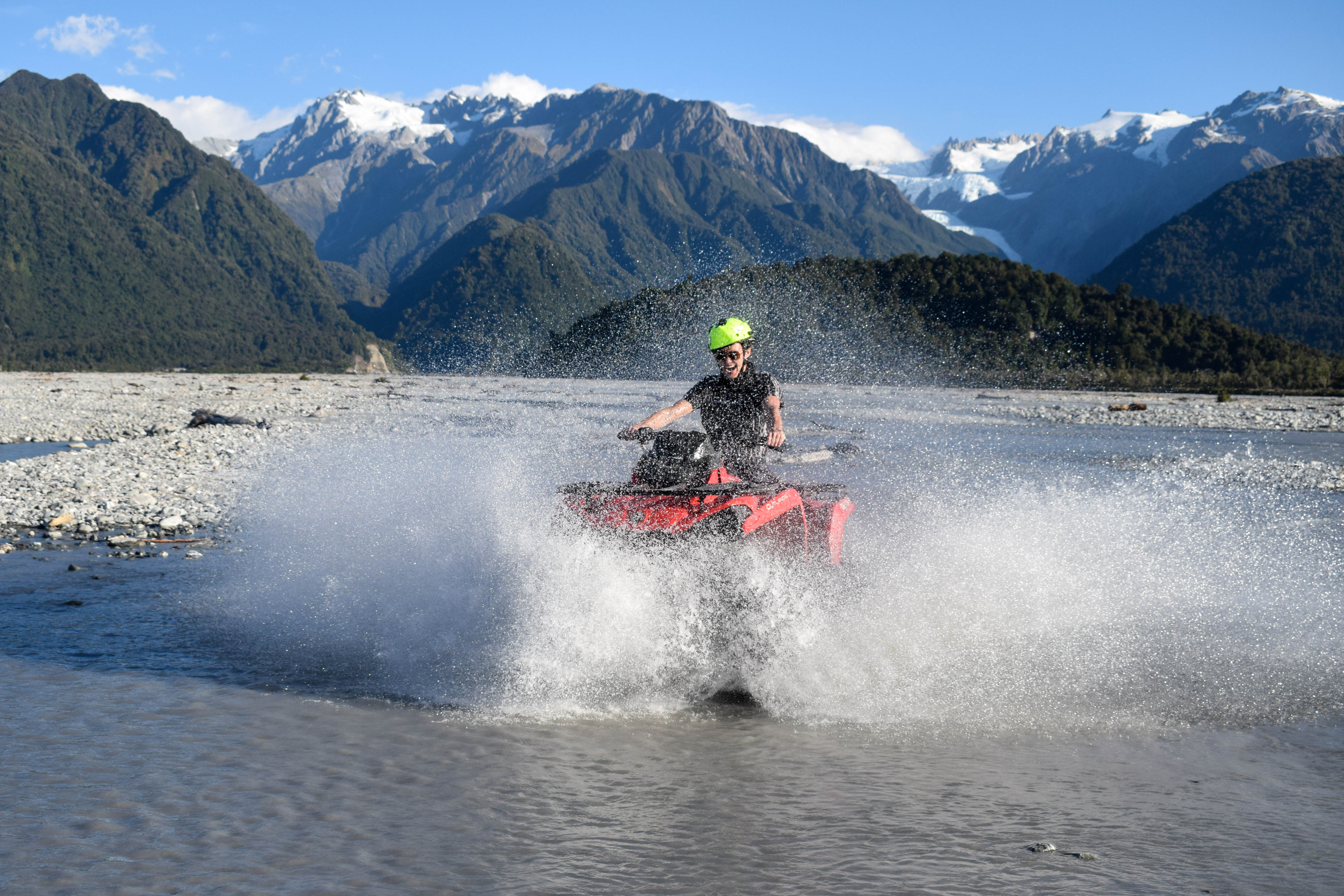 Ride a quad bike or 3-seater buggy through a beautiful Jurassic rainforest, splash through rivers and explore an ancient glacier riverbed. Enjoy our incredible backdrop of the spectacular Southern Alps and Franz Josef Glacier as you follow your guide through our tracks.