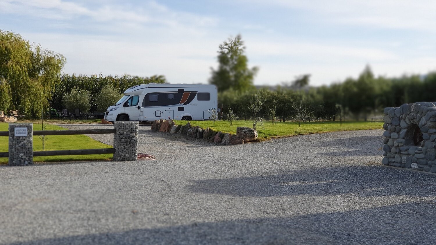 Set against the Olive Grove with views of the vineyard and mountains two parks are available for fully self contained Camper-vans with a permanently fitted toilet only (No cars /station wagons/people mover style vans or tents). Toilet hours 12noon-9.30pm. No shower, bathroom or kitchen facilities available. Showers are available at the local Swimming Pool complex. (We are an adults only property). Available to guests are our Hot Pools (charges apply). Also available for guests to hire is a tandem bike (Pedal Power), helmets and vests provided. All our guests are invited daily at 5pm to our tasting room for a complimentary wine tasting/glass of wine/beer or a non alcoholic drink. The bar will remain open after if you wish to purchase further drinks. Check in is till 7pm and checkout is 11am. Guest credit card details are required when checking in for payment or any possible incidentals that guest may occur. Credit card details are not kept on file after guest leaves. River Rock Estate is not suitable for children under 18 years of age. We ask that you do not bring pets. We also remind guests River Rock Estate is a working vineyard so guests may encounter working machinery, spraying, frost fighting and bird scaring.