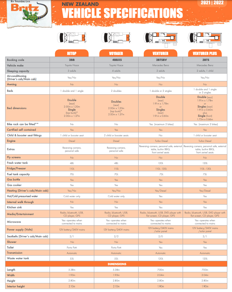 BondBond amount: NZ$0 Bond note: A credit card authority is taken to allow for the recovery of any amounts due by the customer during or upon conclusion of their campervan rental. These charges include but are not limited to: vehicle cleaning (this includes toilet and waste water tank emptying, deep clean if an animal or smoking has been permitted in the campervan), traffic infringements (eg speeding, parking), tolls or freedom camping fines, On Road charges relating to towing, delivery and return of vehicle, late return fees, refuelling with diesel or petrol, or refilling LPG, rental extensions, road restriction penalties. For security purposes, only the customer's credit card can be used for the Credit Card Authority. What is bond? A bond is a dollar amount entrusted to the campervan company by the hirer. It covers costs for vehicle/equipment damage or if the conditions of hire are not satisfied. The bond is made available to the campervan company in such a way that it is immediately accessible should they require it (cash transfer, credit card authorisation etc). The bond authorisation is arranged at the beginning of the hire period and cancelled or refunded when the transaction is completed. |