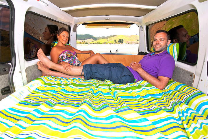 Standard excess $3000.00, 24 Hour Roadside Assistance, Air Conditioning, Free kilometres and additional drivers at no extra cost, Stereo with MP3 front aux. port, Full Queen size bed & free bedding (professionally dry cleaned before each hire), 3 beach chairs (free), Gas cooker, gas cartridge, sink with running water, Chilly bin, 240V Mains power connection cabling (for use at powered sites), Mains powered heater and lamp, Heaps of storage room (300 litres plus), Cooking and living equipment (cutlery, crockery, pots, pans etc.), portable toilet, Free Escape discount Guidebook, Department of Conservation campground guides, Free SIM Card for mobile phones, Free snow chains during winter (May to September – Available on request and subject to availability)