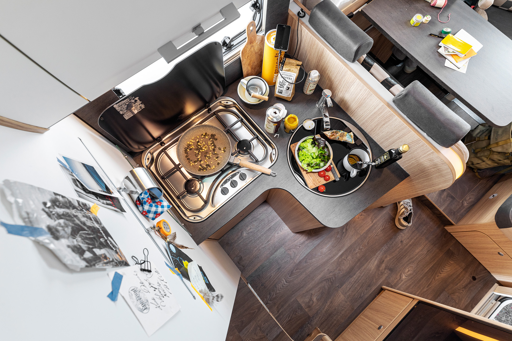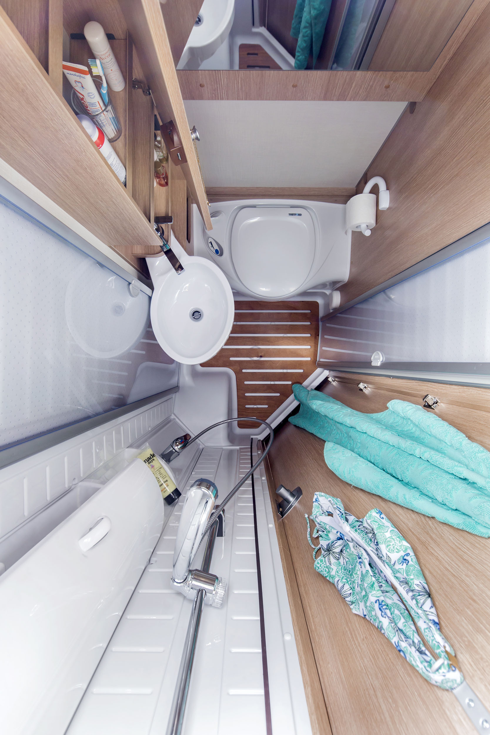 The passenger seats are part of the comfortable four-seater dinette situated directly behind the cab, so young children are seated directly behind the driver and passenger when travelling. The layout is completed with a washroom with a shower over toilet cubicle, and a modern, spacious kitchen in centre of the vehicle. There are two beds. One double island bed at the rear of the vehicle (option to split this into two singles), and a second drop-down double over the dinette.