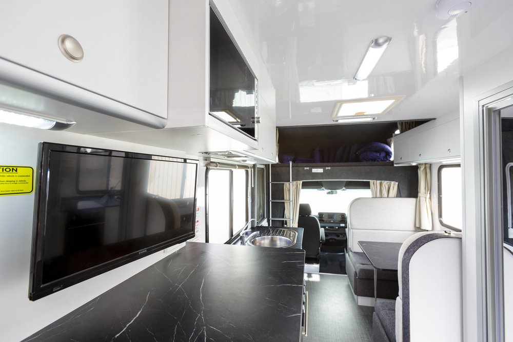 There’s plenty of space in this stylish motorhome, with a well-equipped kitchen, areas to eat and entertain, plus heaps of storage.