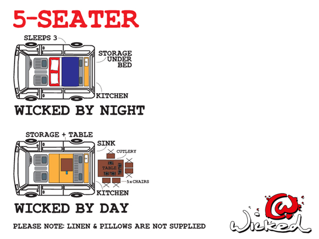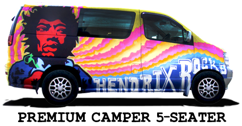 The Nissan El Grand's and Regis are our Premium Campers and the newest additions to the Wicked Fleet. With a V5/V8 engine, power steering and dual air-conditioning these are the latest Wicked Campers to hit the New Zealand highways. The Nissan El Grands seat up to 5 people and are customised like all the Wicked vans in our fleet - complete with table, loads of room for your luggage and a kitchen out the back (pots, pans, cutlery, gas cookers and cool box all included).