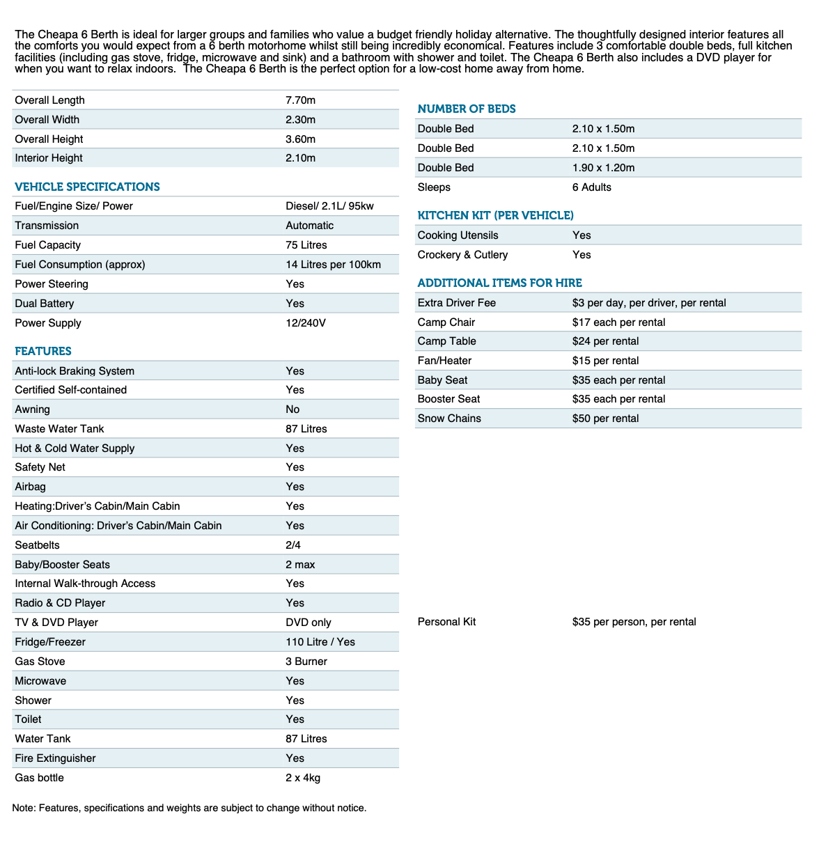 The thoughtfully designed interior features all the comforts you would expect from a 6 berth motorhome whilst still being incredibly economical. Features include 3 comfortable double beds, full kitchen facilities (including gas stove, fridge, microwave and sink) and a bathroom with shower and toilet. The Cheapa 6 Berth also includes a DVD player for when you want to relax indoors. The Cheapa 6 Berth is the perfect option for a low-cost home away from home. Perfect for larger families, up to 3 x couples or up to 6 mates.