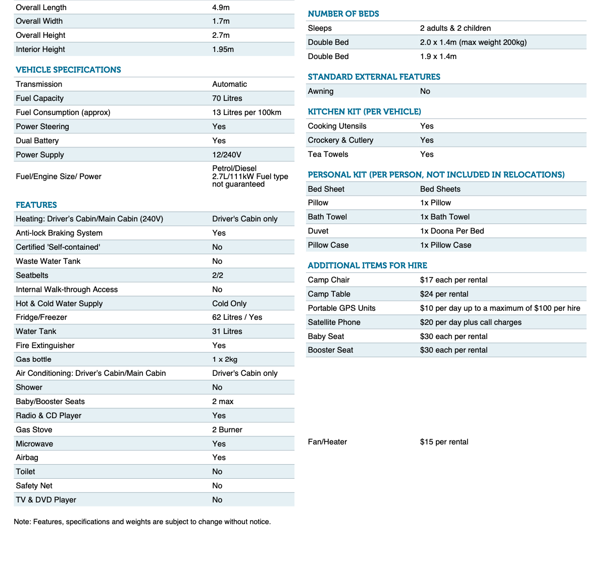 Sleeping CapacityWhat number of people does this vehicle best suit? 4 Berth A four berth vehicle is great for families or couples who want room to groove. Not Self contained 3 Berth A three berth vehicle is great for couples with a child or those who want a bit more space. Not Self contained 2 Berth A two berth vehicle is a great option for getting the best driving flexibility. Not self contained |