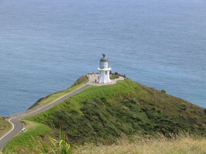 The sealed track is wide and even, descending to the lighthouse above Cape Reinga.