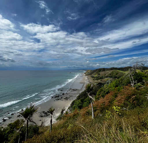Steep cliffs clothed with stunted tea tree and flax have pied shag filled pohutukawa at their bases. High pingao covered dunes are near the carpark.