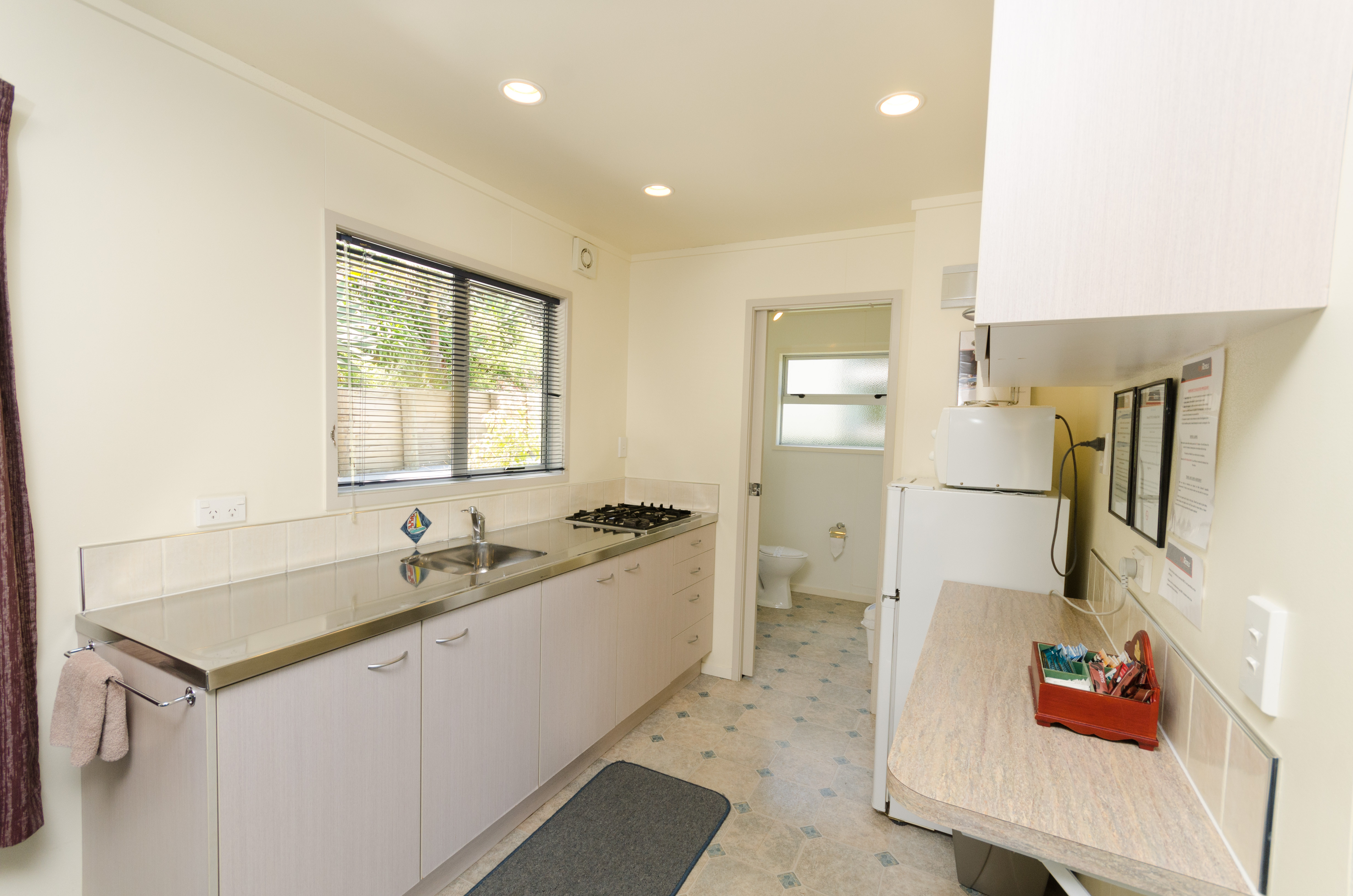 – Kitchen facilities including fridge, microwave, cooktop (gas 4-burner), electric frypan, toaster, crockery, cutlery and utensils