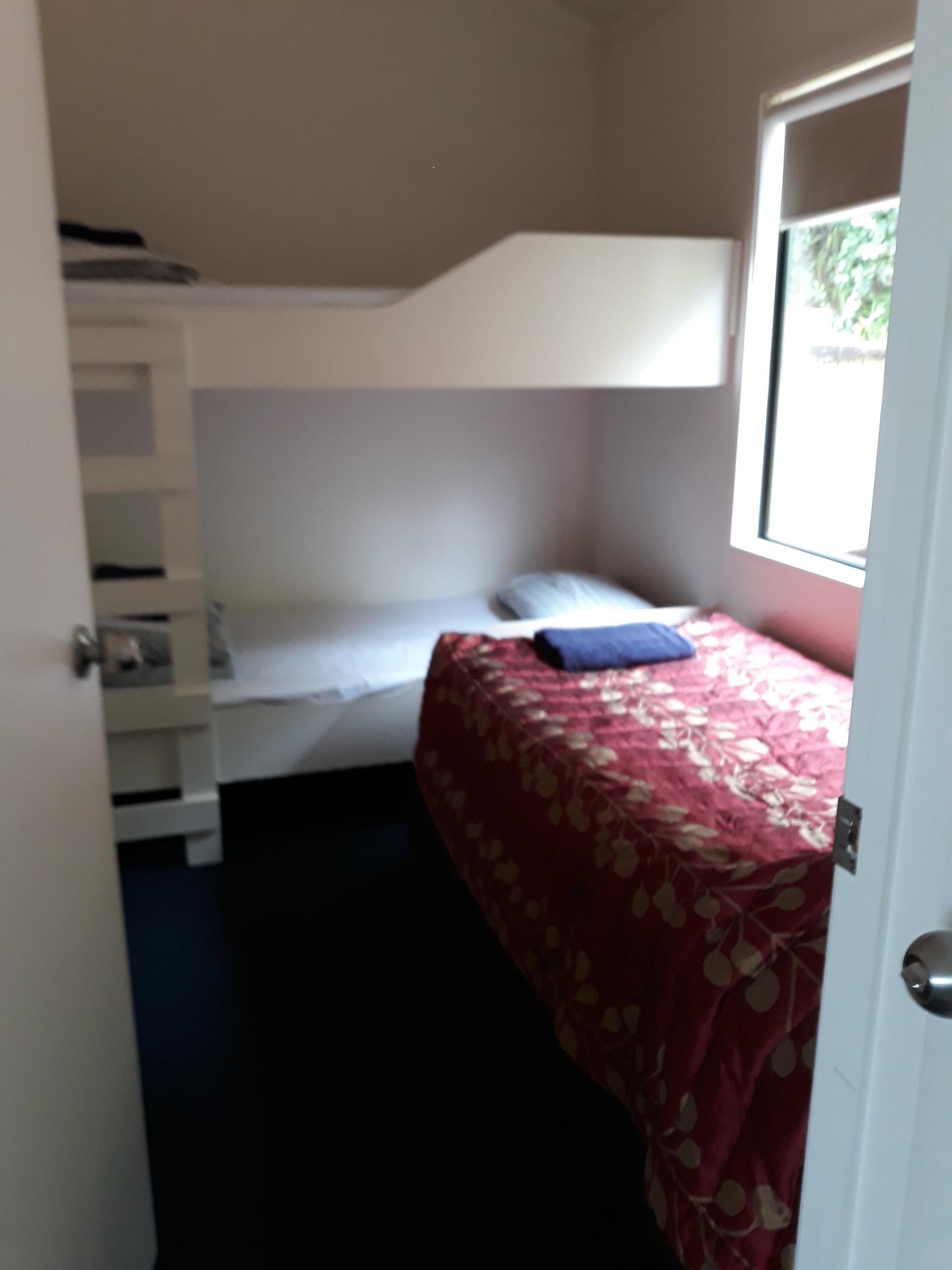 In the second bedroom, there is a set of fixed bunks, and a single bed all made up with linen.
