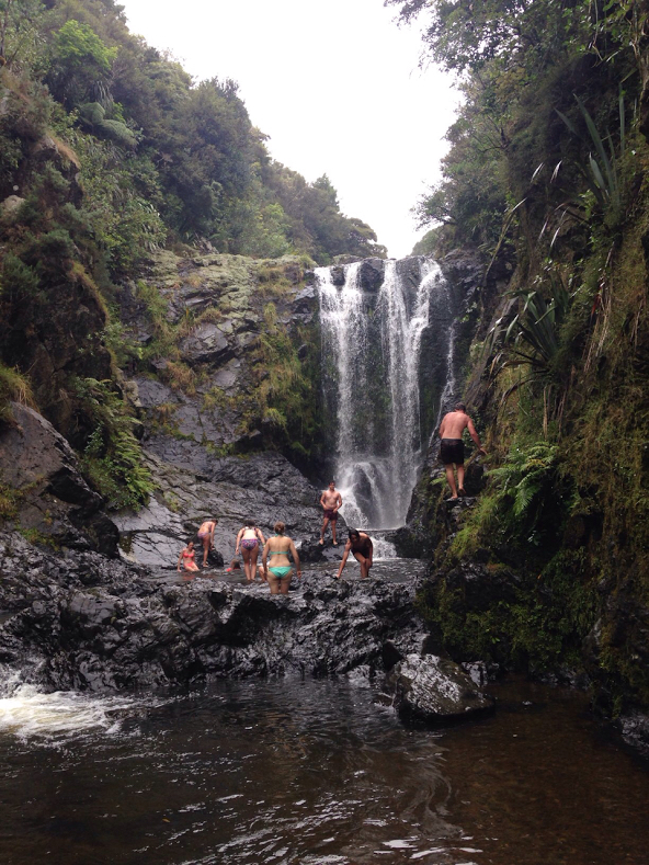 The track is a short, steep zigzag down through bush into the gorge. You cross the Ahuroa River on a concrete slab bridge with “Rotary 1983” engraved on it (the track was built and upgraded courtesy of Maungaturoto Rotary Club). About five minutes after crossing the bridge, you can view the picturesque Piroa Falls from beneath.