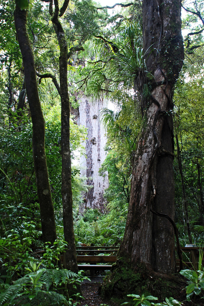 Over 15% of the recorded species in the Waipoua Forest live as an empire of epiphytes in the clefts between his upper branches. Moisture collects in these hollows and a moss begins to form. This creates an embryonic soil for a seed, either blown by the wind or dropped by a bird, to germinate. The leaf litter accumulates and develops humus, sustaining the plant. In this way a hanging garden evolves in the tree.