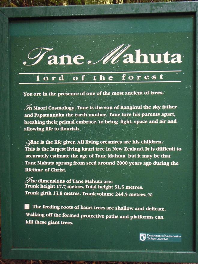 This is a spiritual place - According to Maori mythology Tane is the son of Ranginui the sky father and Papatuanuku the earth mother. Tane was the child that tore his parent’s parental embrace and once done set about clothing his mother in the forest we have here today. All living creatures of the forest are regarded as Tane’s children.
