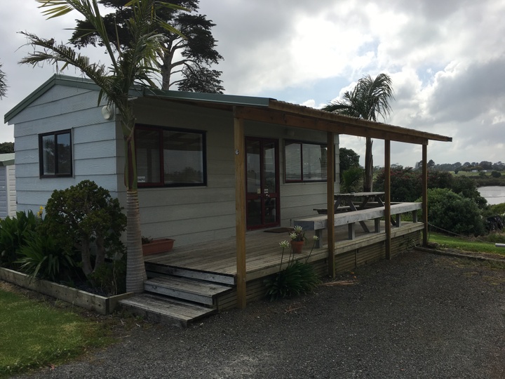 The main living area has a comfortable couch, dining table and chairs, and a TV. The spacious deck has outdoor furniture to relax upon and you can take in the surrounding sea air and sunshine here at Clarks Beach Holiday Park.