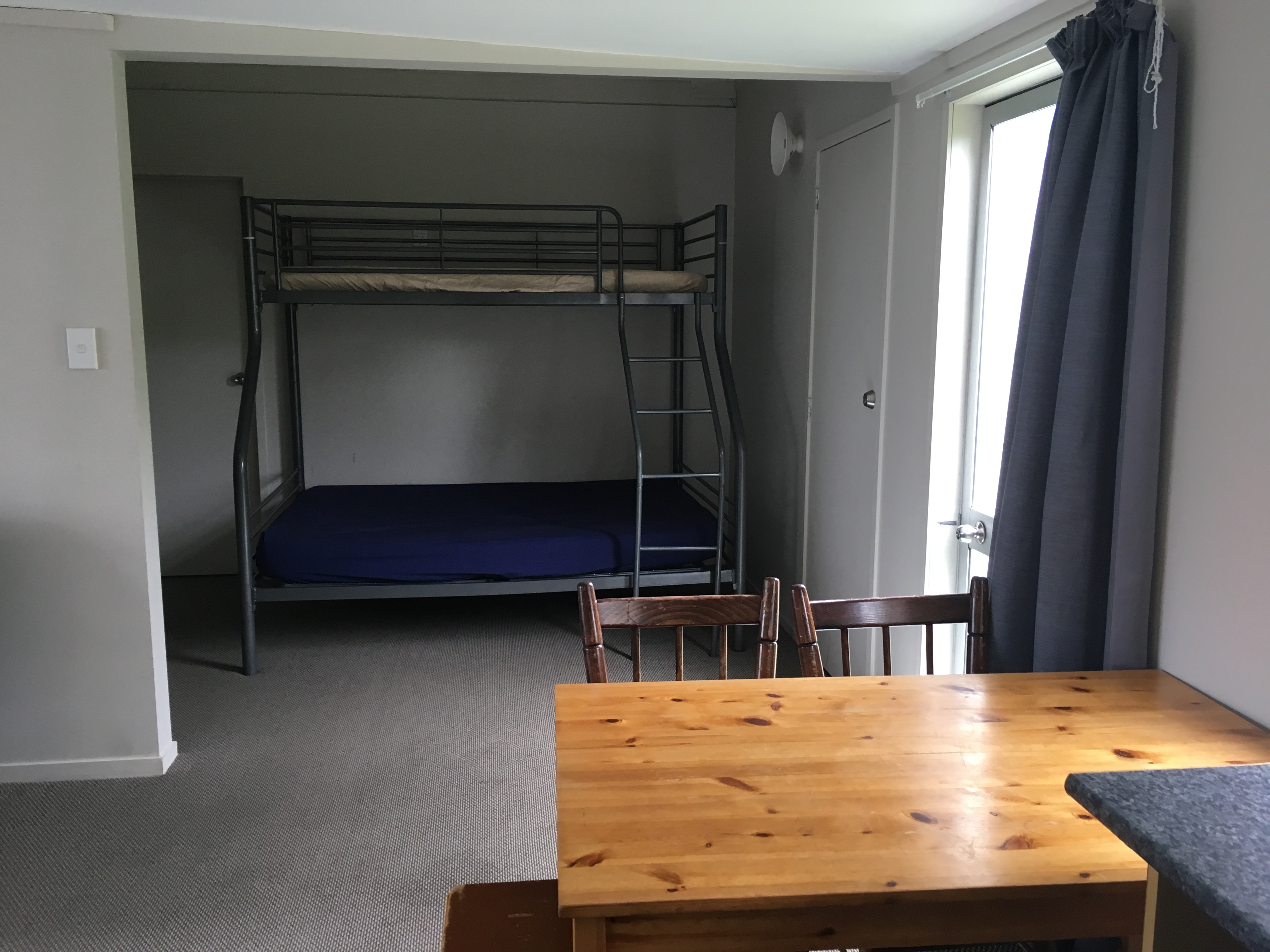 There is also a fold out couch, toaster, jug, some plates, a fridge/freezer and a TV. There is also another room next door also with double bed, bunk above, and single beds. Both can be booked for larger groups with internal access available between the rooms. Note - short walk to toilet and shower block as no bathroom facilities in this cabin.