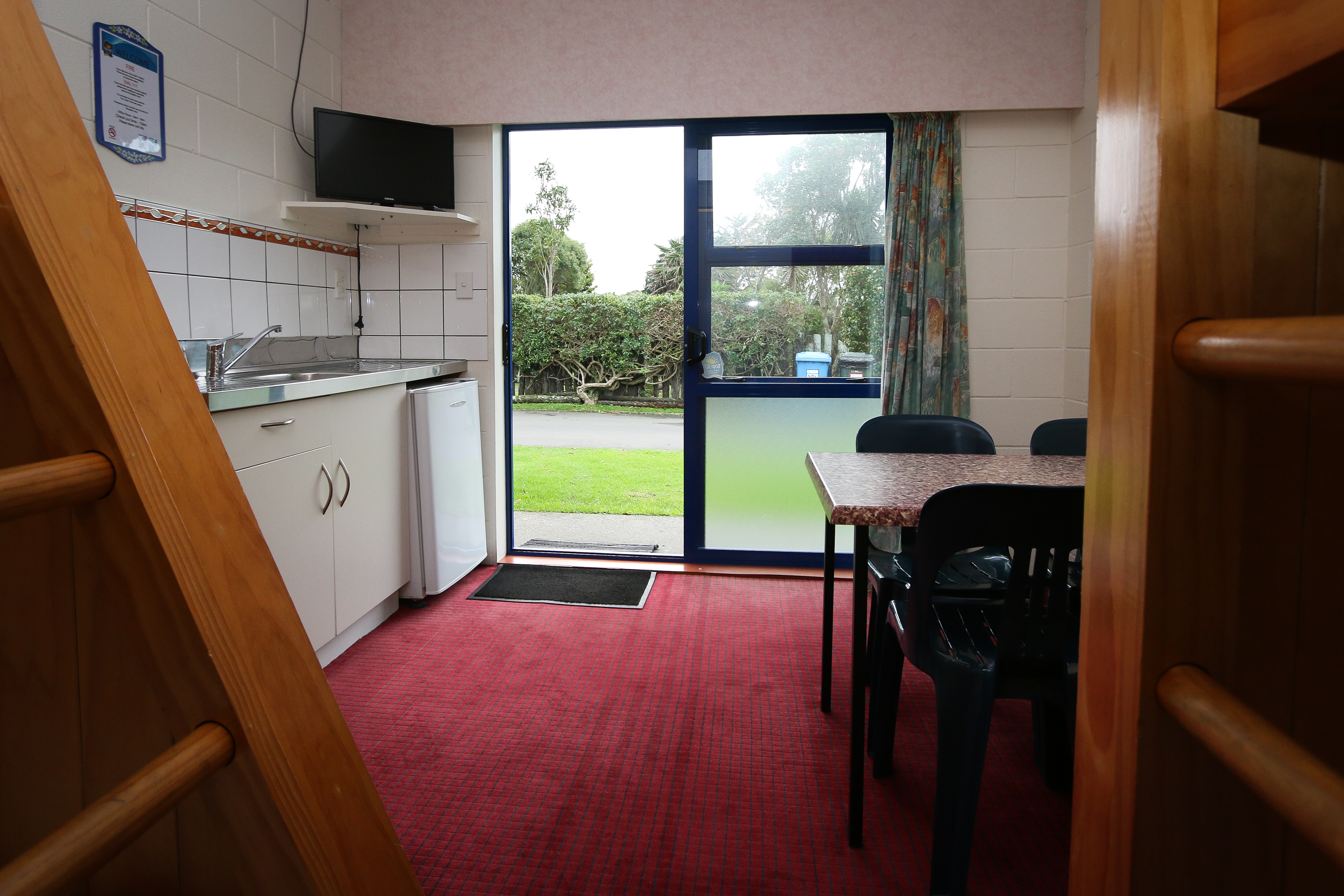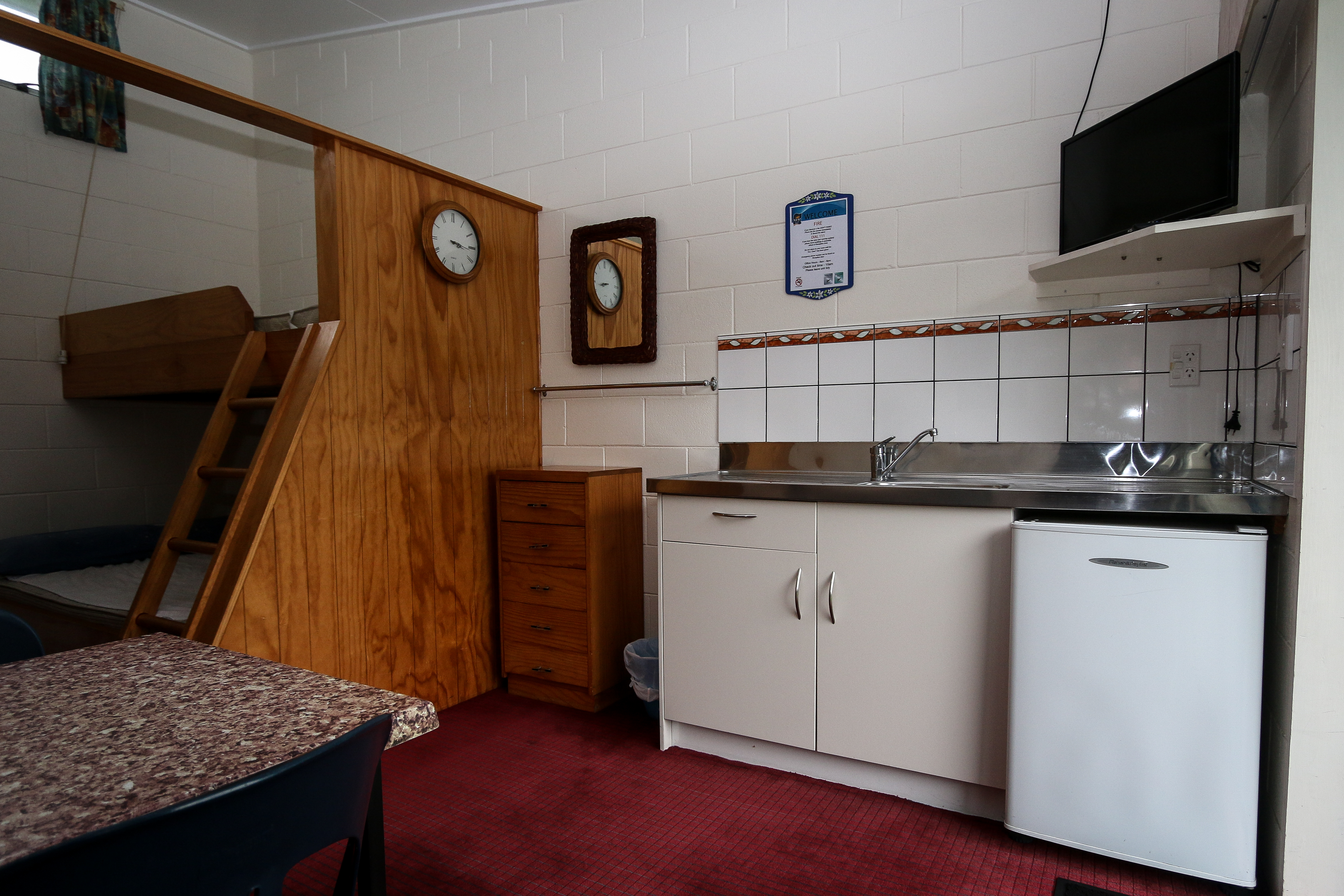 Deluxe Cabins are studio-style units with beds at the back and table & chairs at the front with kitchenette. Double bunk with single on top, there is a single bed or single bunk beside it with a set of drawers.