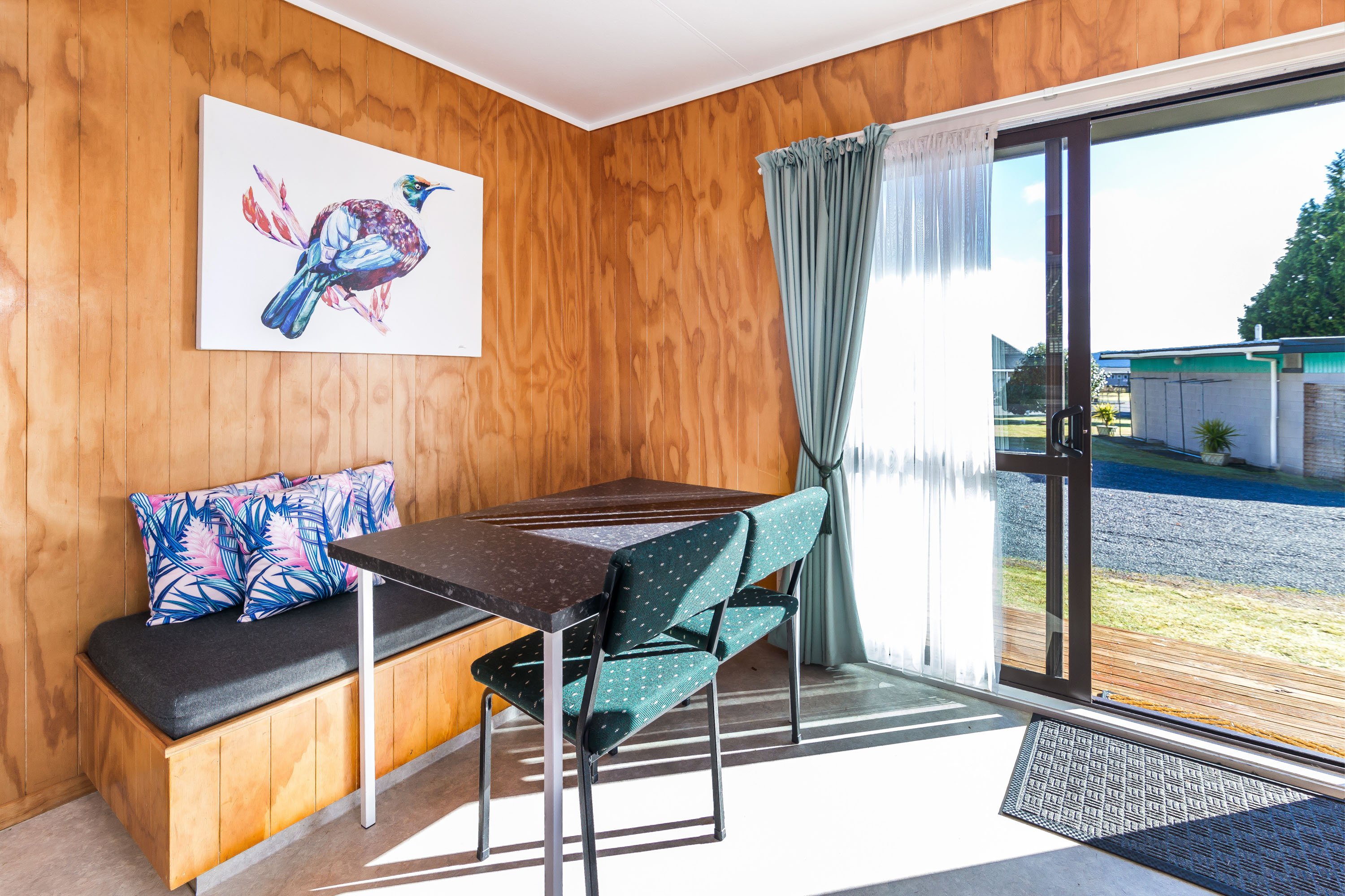 This deluxe cabin sleeps up to 3 people with a queen bed and a single bed sharing the same bedroom. Linen and towels are provided The living area contains a flat-screen television, DVD player, dining table and heater. The deluxe cabin's kitchen is equipped with a microwave, bar fridge, crockery, cutlery, tea & coffee, jug and toaster. This room doesn't have a private bathroom but there is a communal toilet/shower block close by which you are welcome to use.
