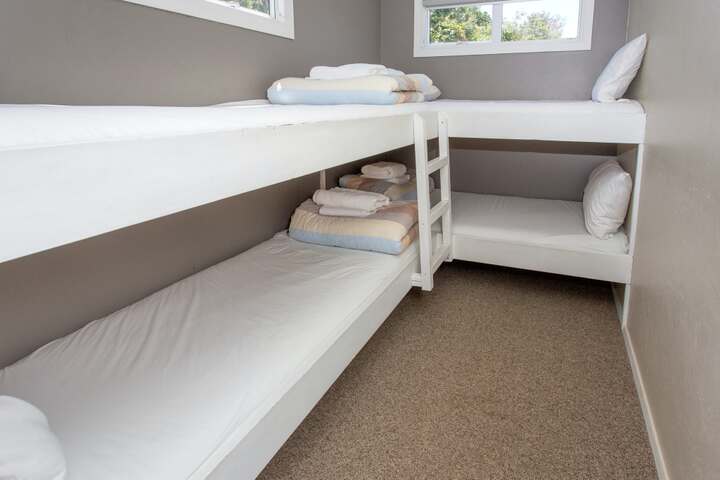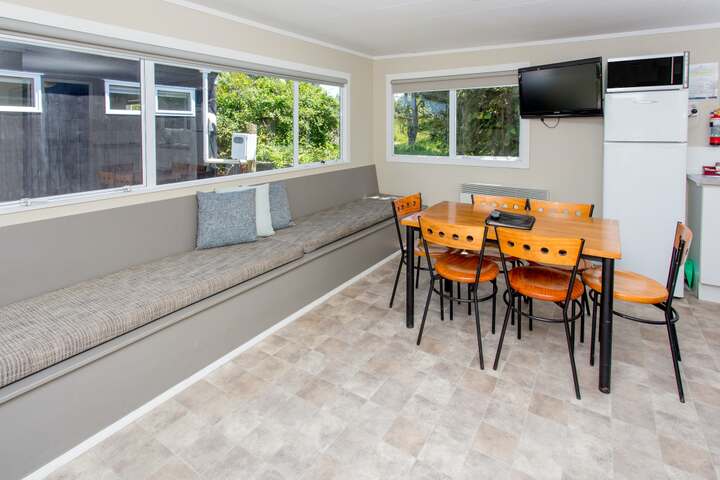 These older style lodges are setup with a Queensize bed (bedding and towels provided), a further bunk room with two sets of bunks, a small kitchette with a microwave, hot plate, fridge/freezer, cooking utensils and TV. Shower and toilet is in the room. There is indoor-outdoor seating with a small deck on the front of the unit.