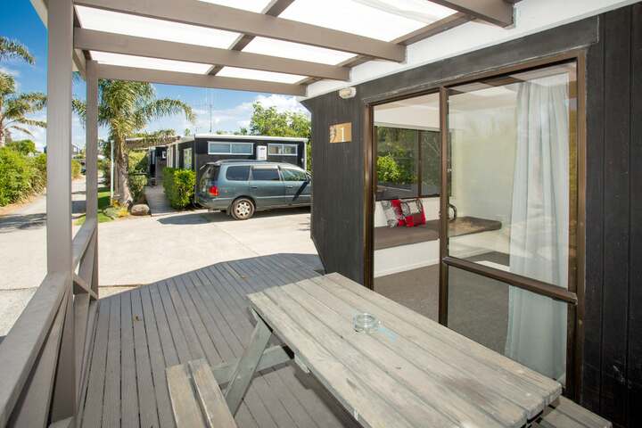 This older style lodge is setup with a Queensize bed (bedding and towels provided), a small kitchette with a microwave, hot plate, fridge/freezer, cooking utensils and TV. Shower and toilet is in the room.