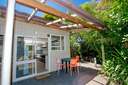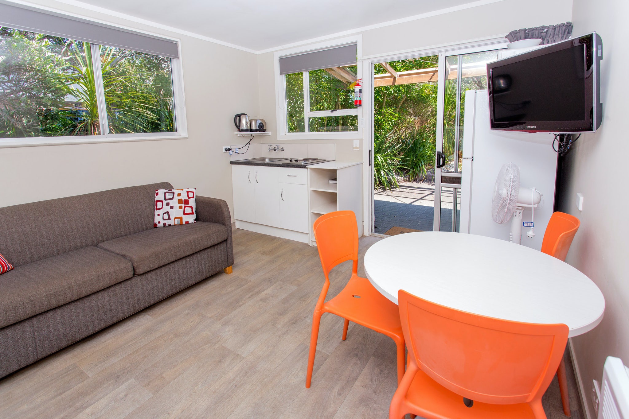 Each room comes with its own courtyard with outdoor seating and a parking spot. The communal shower and toilet facilities are only metres away. Under the shade of Pohutakawa and close to the stream and a glimpse of the ocean it is a great way to feel like you're camping without facing the elements and having to pack the kitchen sink. The units are all joined together, so if you are a large party travelling together, it's a great way to keep close and to enjoy your holiday as one.