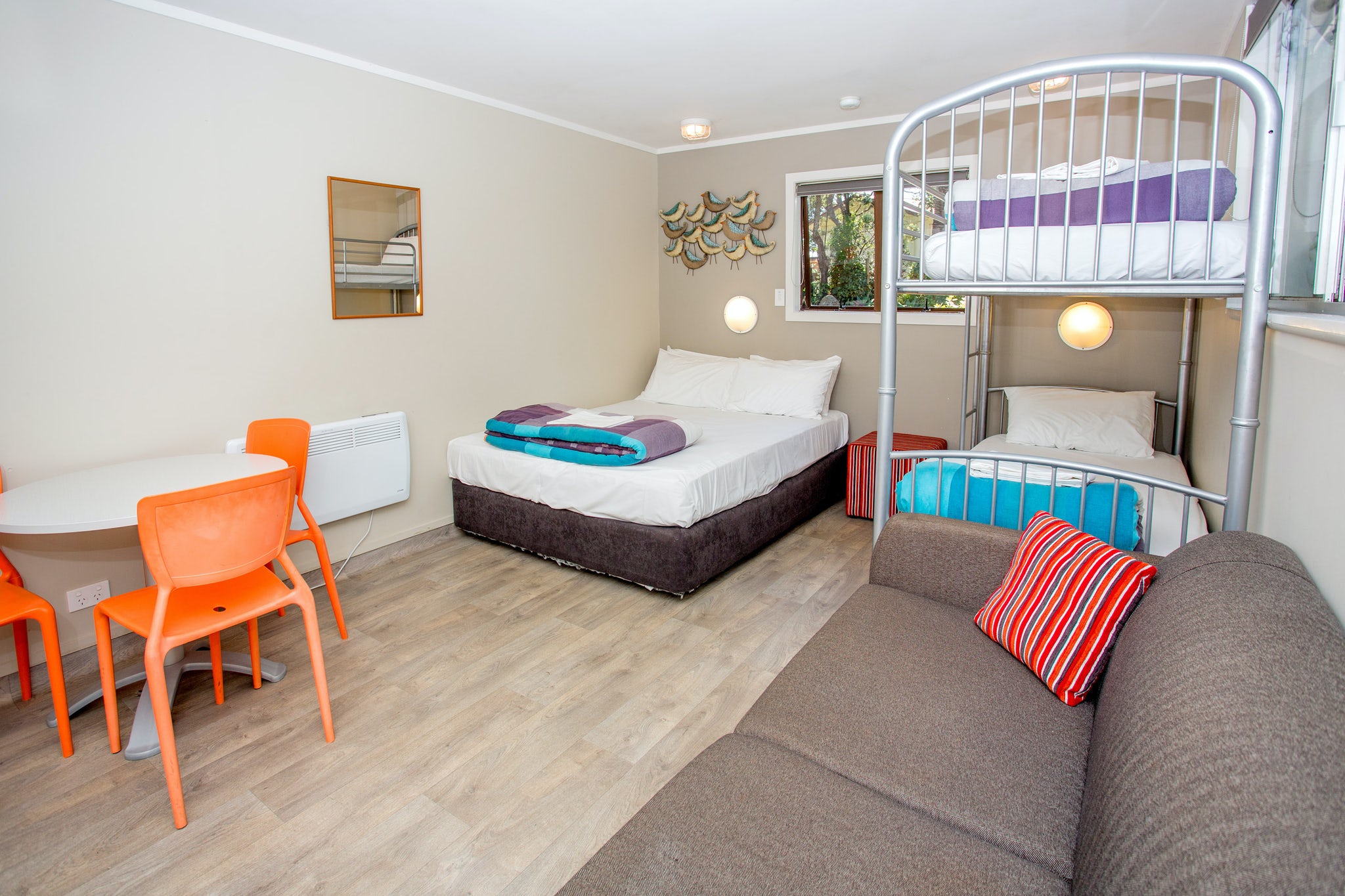 The units sleeping configuration consists of a queen bed, set of bunks and a sofa bed. Linen is provided however towels are not, but not too worry if you don't have space in your bag theses can be hired from the reception.