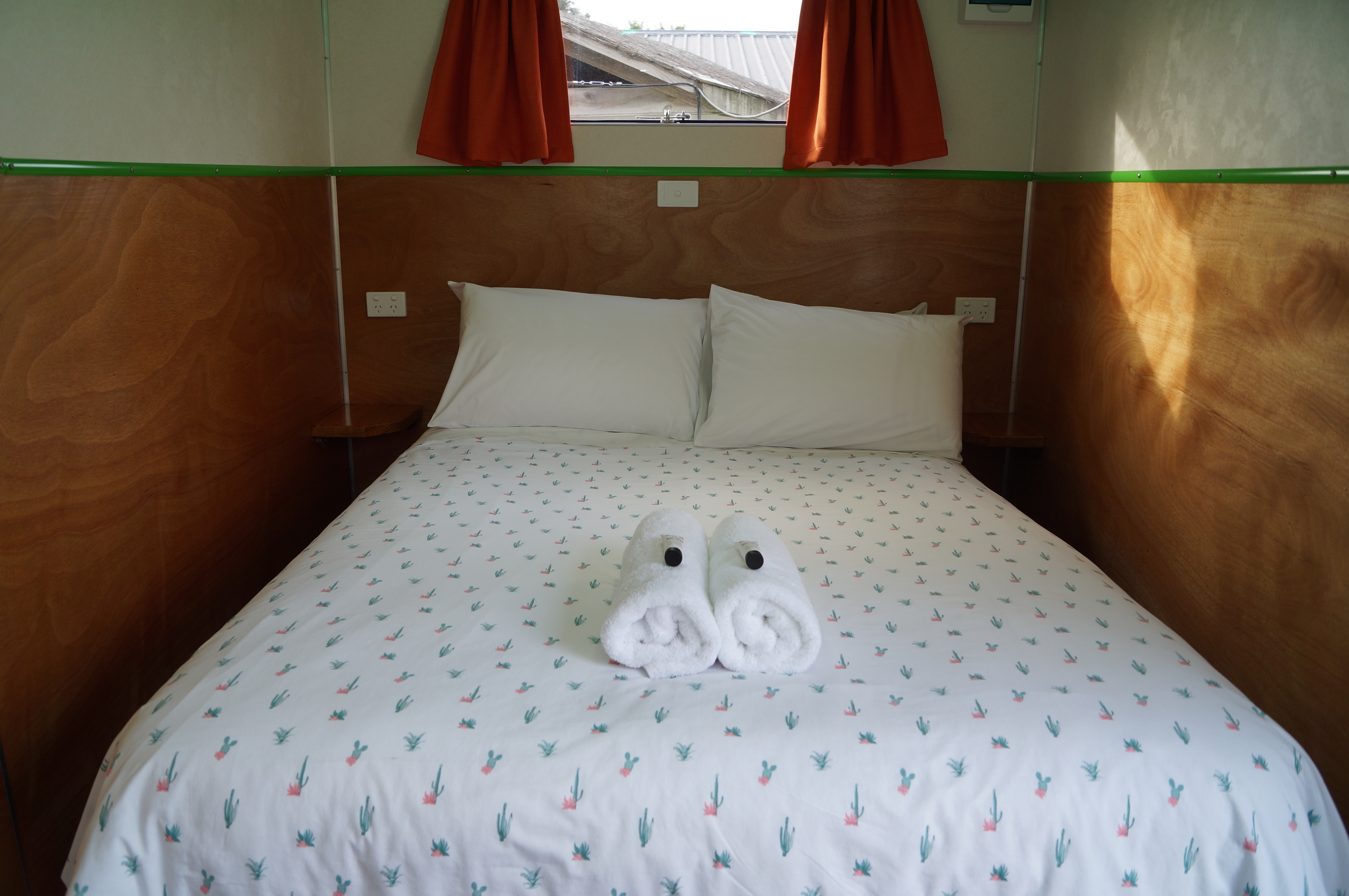 Try our fun new Kombi Cabins they are a basic standard cabin with a double bed and linen supplied, they have tea & coffee making facilities but you will need to use the shared facility block for kitchen and bathrooms.