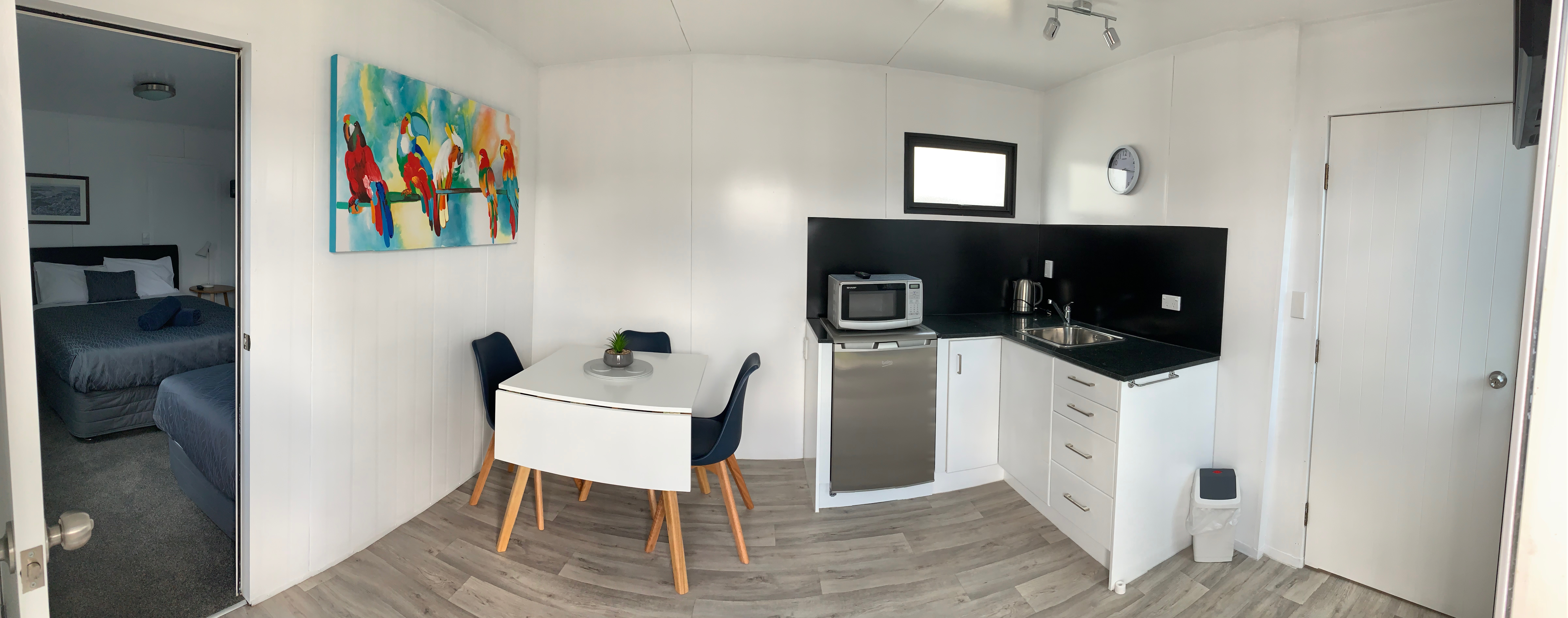 These are a nice clean one room cabin with a choice of double or twin beds and a single car park right outside your door.