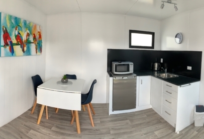 This unit has a separate bedroom with a queen-size bed and a single bed. The dining area has a table and chairs with a small kitchen. Cooking facilities include a single hotplate, microwave, and toaster. The use of our camp kitchen for larger meals is available. It also has a separate toilet and shower and outdoor table and chairs on its own private deck.