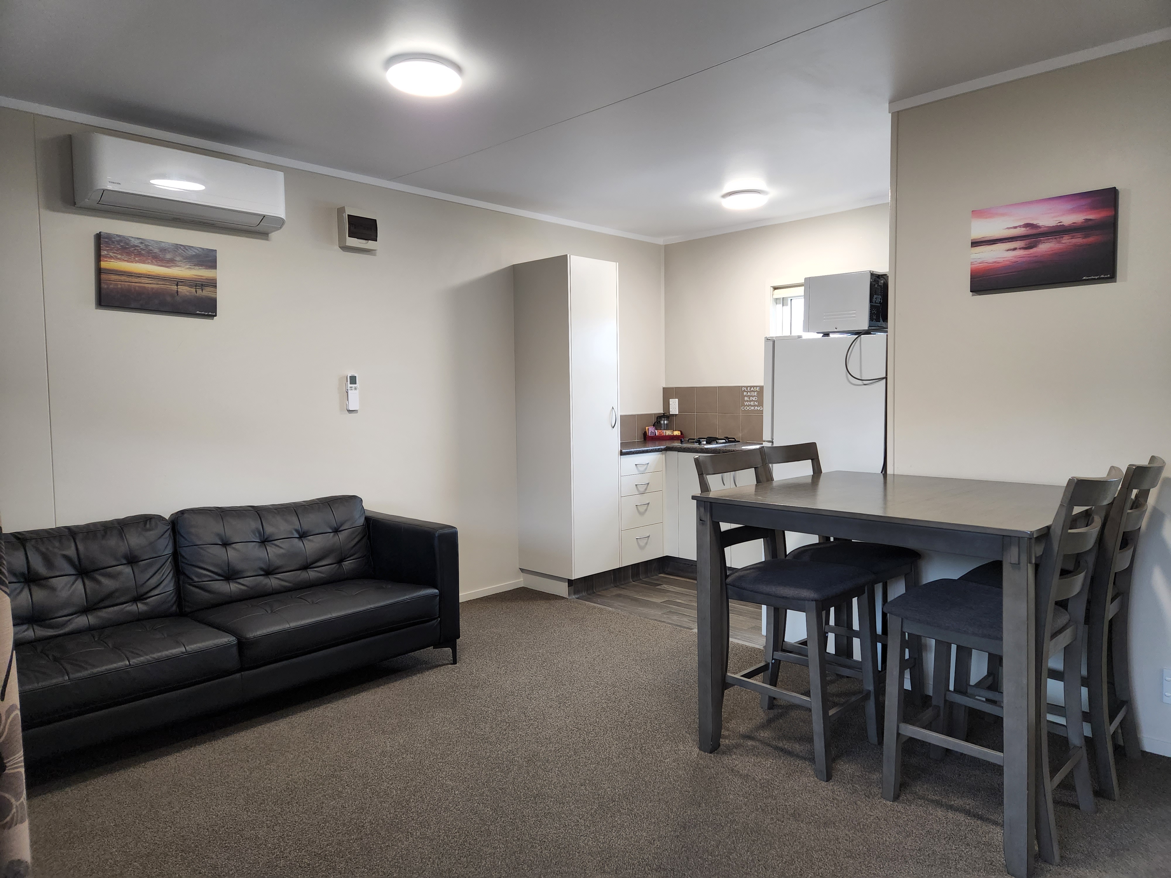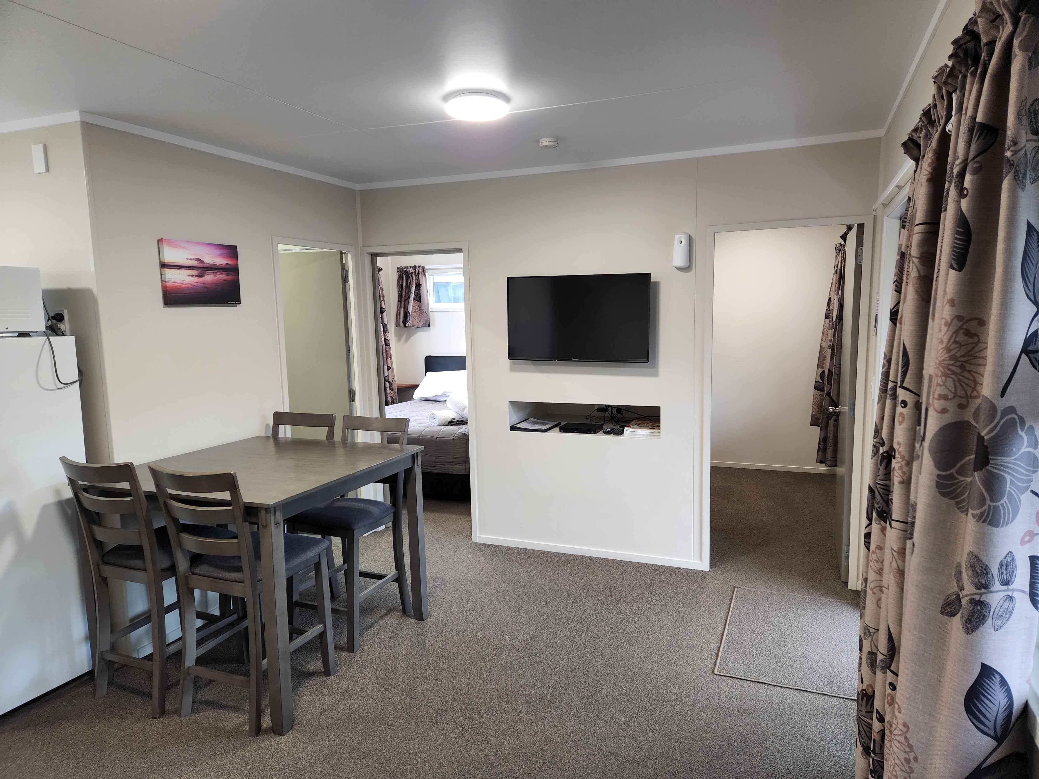 Rooms in our self contained units are configured with a queen sized bed in one bedroom, and a set of single bunks and a roll-away in the second bedroom.