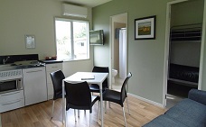 Features include two bedrooms (one with a queen bed, the other with a set of bunks), an open plan lounge/kitchen area with a double sofa bed, dining table, fridge, cooking hob, crockery and utensils, microwave, sink, tea and coffee making facilities, TV and a bathroom with shower, toilet, vanity, and hairdryer.