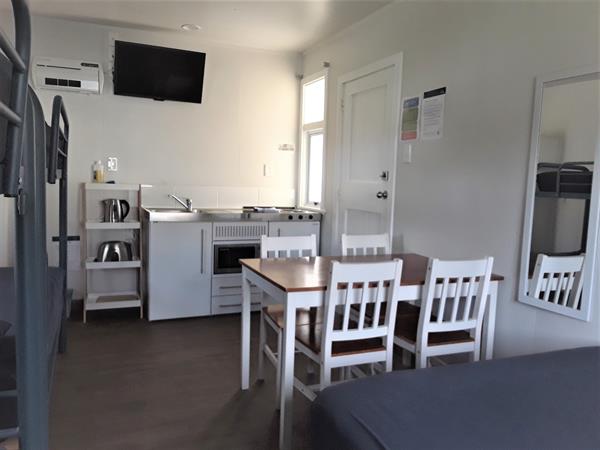 A 6 Berth Kitchen Cabin has one single bed, one single bunk bed and one Duo Bunk (bottom double-single on top). All beds have a mattress protector, fitted bottom sheet, pillows and pillowcases. Guests can hire bedding and towels at an additional charge of $6.50 per person per night or bring their own. There is also a wardrobe, heater and a dining table and chairs in your Kitchen Cabin.