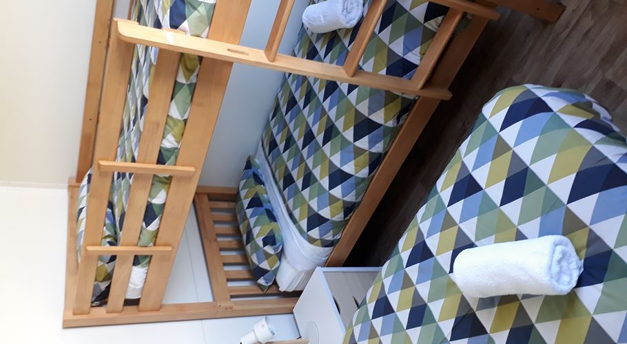 The first bedroom contains a queen bed and the second bedroom contains a single bed and a single set of bunks.