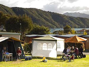 Tents, Caravans, Camper Vans and Motor Homes not only do you have the use of all the facilities we have to offer but you have the choice of 50 powered sites most with views over Waikawa Bay while others are nice and close to the Ablution block and some are closer to the play ground for those with small children.
