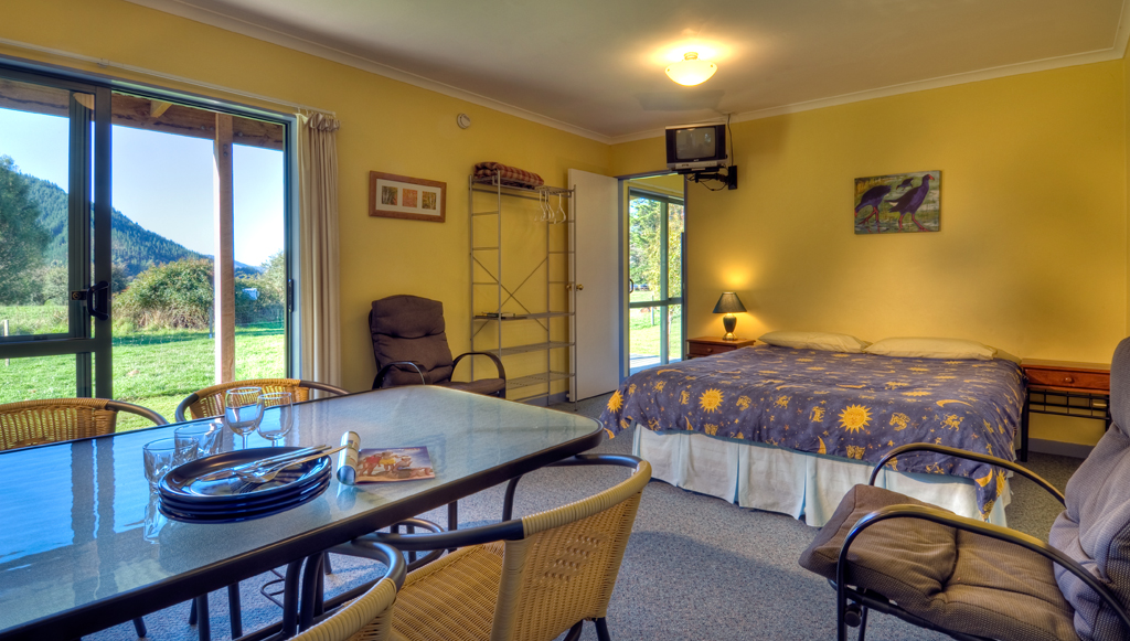 One of the self contained unit has a disabled/access shower and toilet, a kitchenette and t.v. In the main room there is a Queen size bed and in the other room there is a double bed and two single bunk beds.