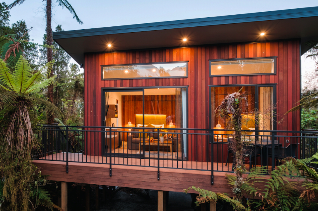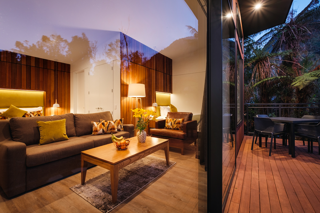Spacious and stylish studio Deluxe Tree Lodges, privately nestled amongst lush rainforest with large spacious decks so you can immerse yourself in nature. Featuring a king and a single bed each with pristine linen and plush pillows for absolute luxury, a large en-suite bathroom with rain shower and underfloor heating, a kitchenette, a Nespresso machine, a sofa bed, and all the modern comforts.