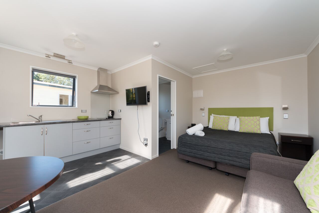 Queen bed in the living area, 2 sets of bunks in a separate room, fridge, microwave, jug, toaster and TV. Use communal kitchen and bathrooms. Supply own bedding or hire.
