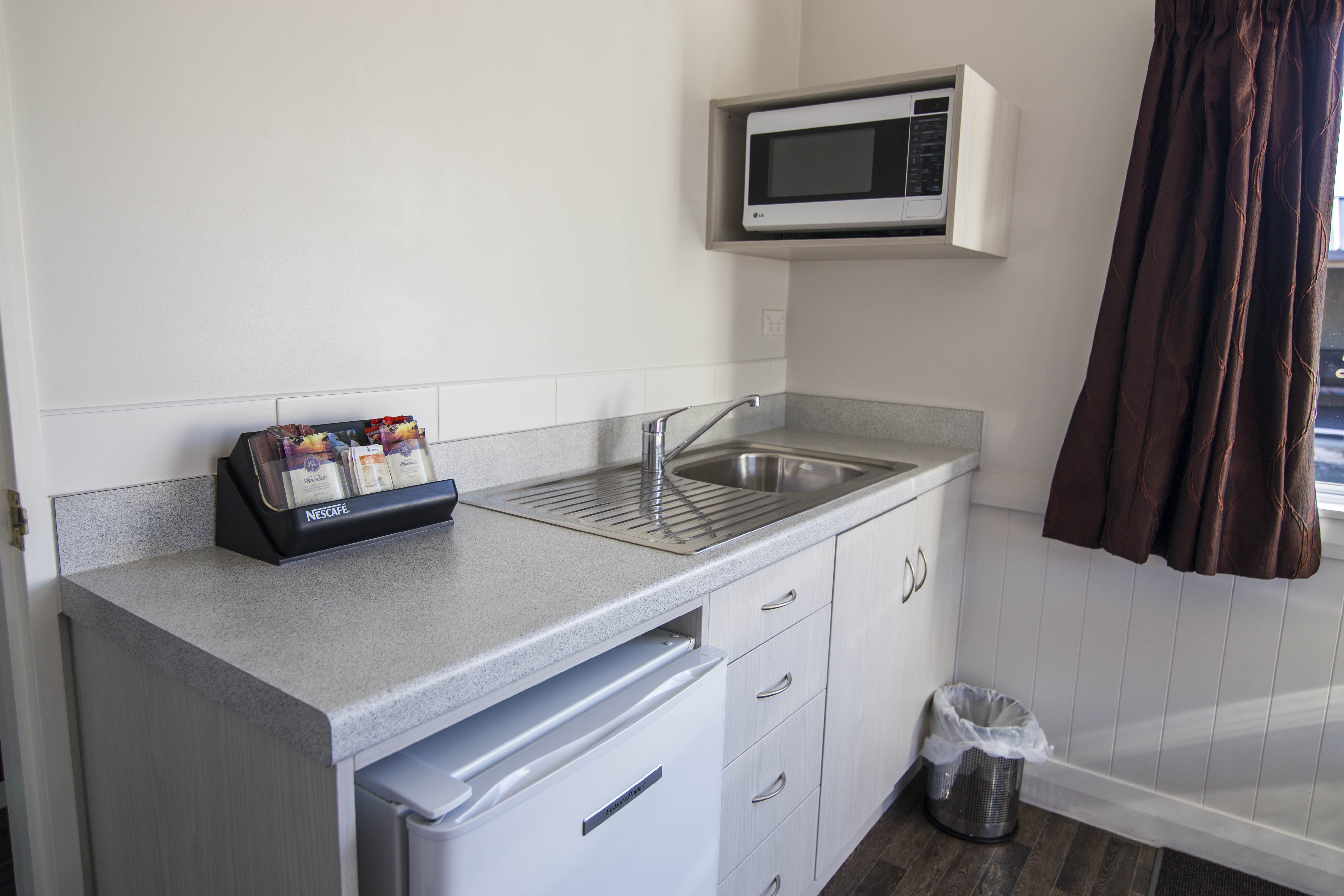 This kitchenette includes a microwave, fridge, electric jug, toaster as well as cutlery and crockery.
