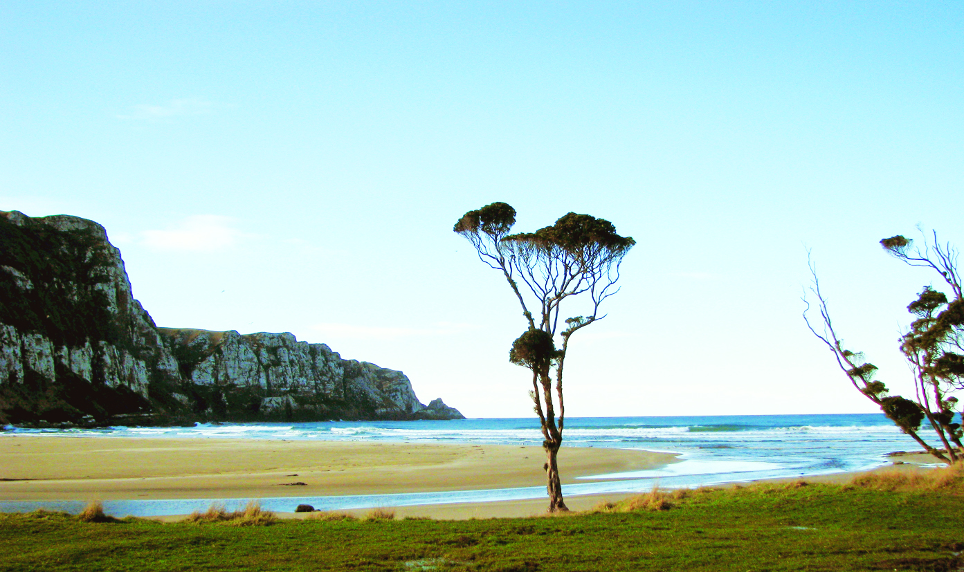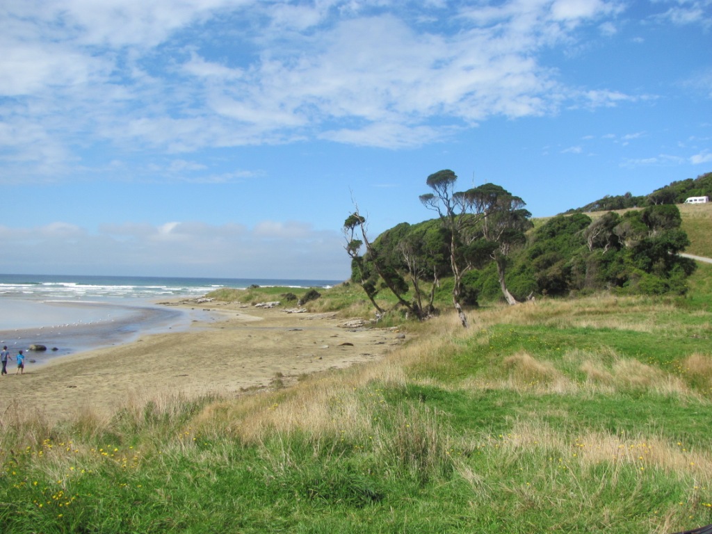 Striking cliff faces can be seen and Purakaunui Falls are not far. There is a good surf beach south of the camp.