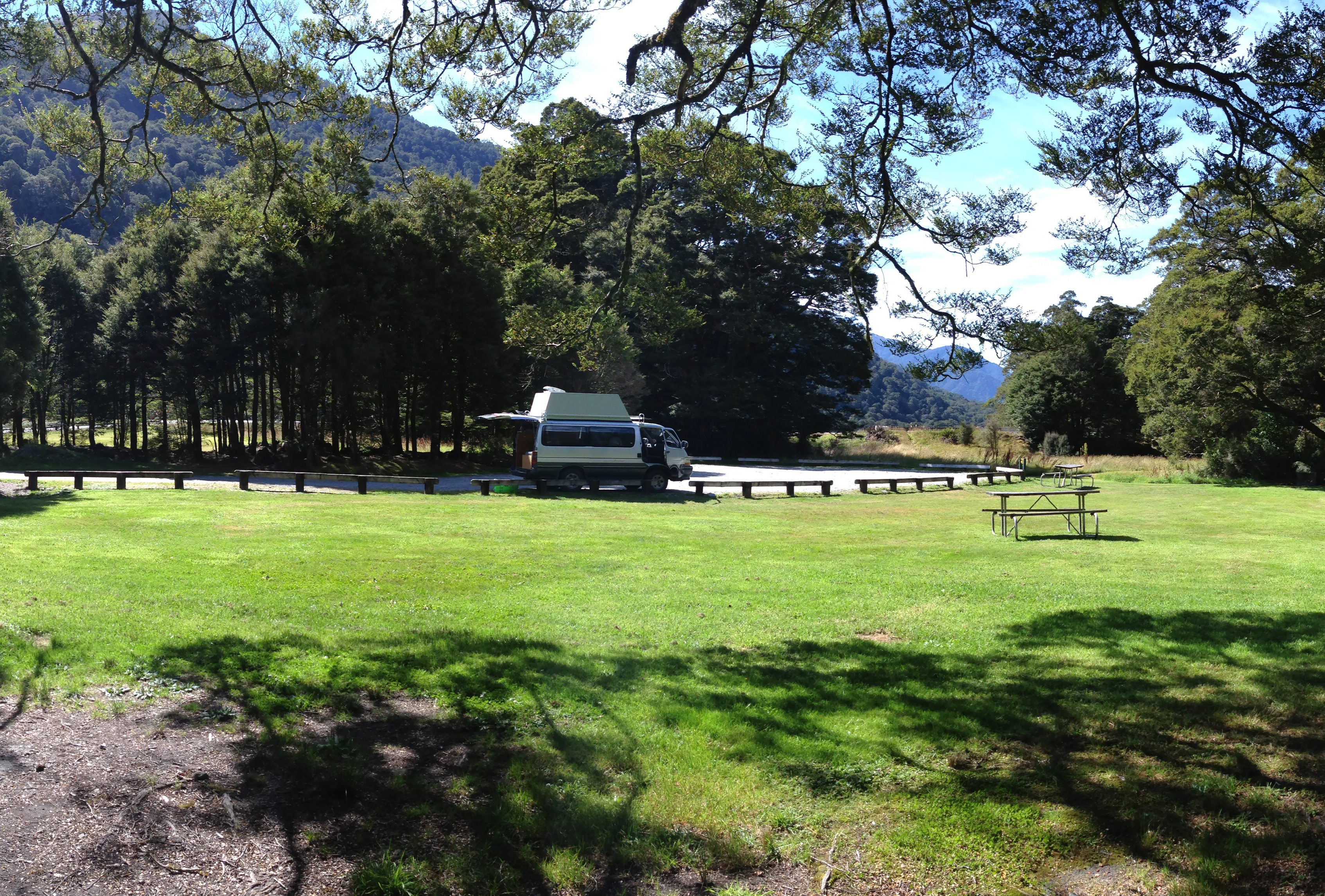 We then stopped here for the night. Looks less nice than Cameron flat I’d say. A basic rest area along the road. Nothing charming. Long drop toilets. Sandfly apocalypse, forget to have dinner or a beer outside, this was serious sandfly madness. Ranger passed in the morning to check payments.