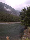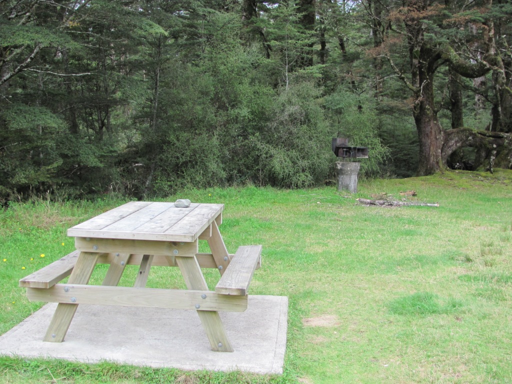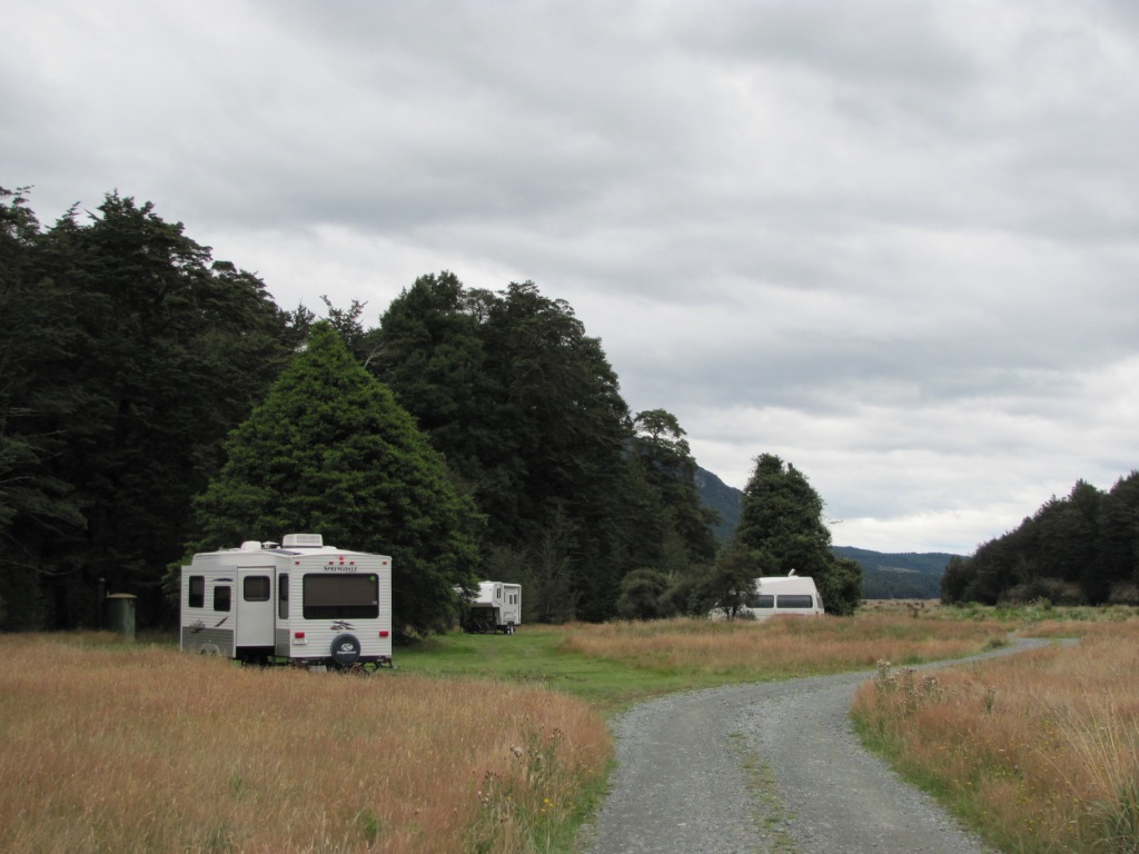 A large sheltered campsite just off the main road and right next tor the river with easy access for large vehicles. It is nestled in amongst large trees and grassy areas, with picnic tables and BBQ's scattered throughout the site.