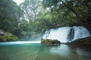 The curious architecture of the Tarawera Falls stems from the cracks and fissures in the huge block of rhyolite lava ejected by Mount Tarawera around 11,000 year ago. These weaknesses in the rock capture the course of the river, approximately 30 metres behind the cliff face, and weave an underground network of watercourses that re-materialise through the hole in the cliff.